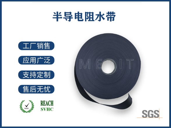 三、電氣特性:半導電阻水帶具有吸濕性強、膨脹率大、膨脹速率快的特點,產(chǎn)品電阻小,具有半導電特性,能有效緩沖、弱化電場強度,機械強度高,易于各種電纜繞包和縱包加工,產(chǎn)品耐熱性好,瞬間耐溫高,電纜可在瞬間高溫時保持性能穩(wěn)定。